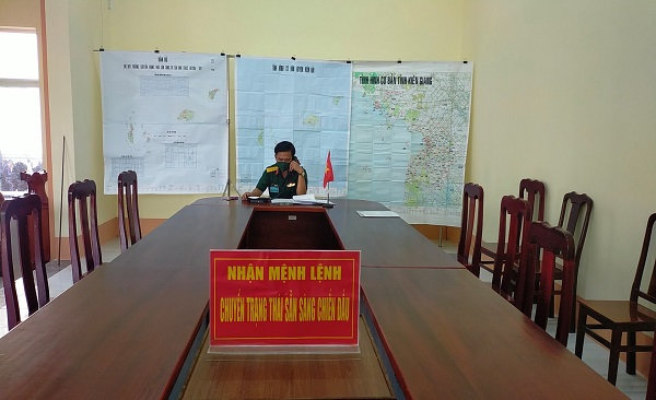 Quang cảnh: Đồng chí Thượng tá Đoàn Hữu Lợi, Ủy viên Ban Thường vụ Huyện ủy, Chỉ huy trưởng, Ban CHQS huyện Kiên Hải, luyện tập triển khai mệnh lệnh chuyển trạng thái sẵn sàng chiến đấu cho các cơ quan.