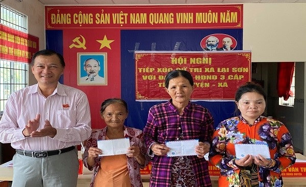 Quang cảnh: Đại biểu Hội đồng nhân dân tỉnh cùng tổ đại biểu Hội đồng nhân dân huyện, xã tiếp xúc cử tri tại ấp Thiên Tuế, xã Lại Sơn, huyện Kiên Hải.