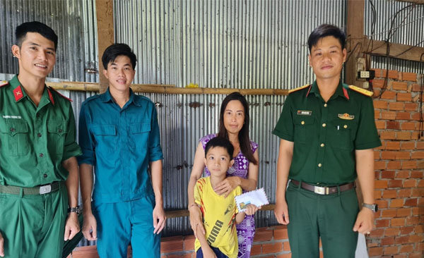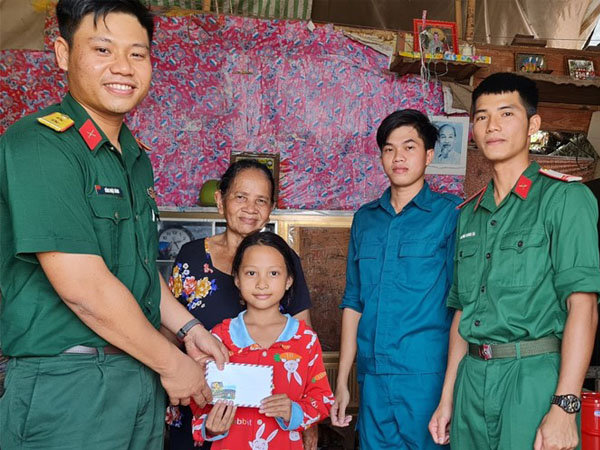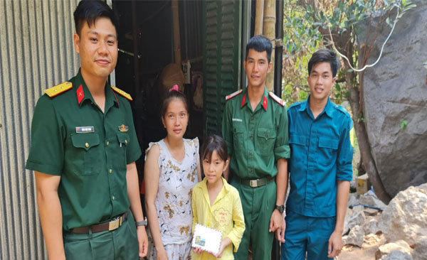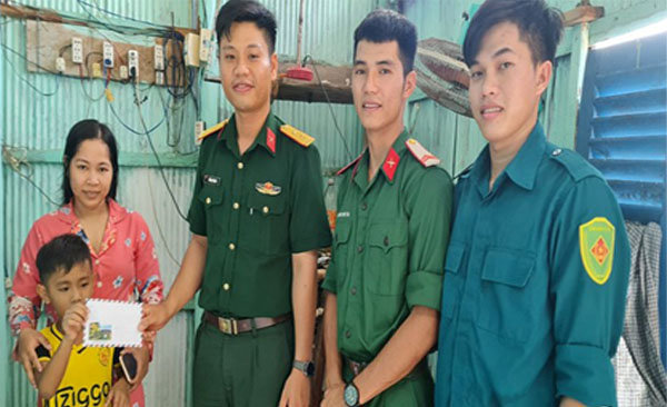 Quang cảnh: Đồng chí Trung uý Hồng Nhật Đăng - Bí thư Đoàn cơ sở Ban CHQS huyện Kiên Hải tặng quà cho các cháu