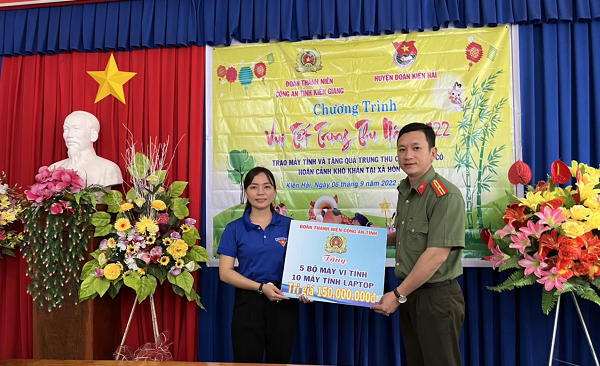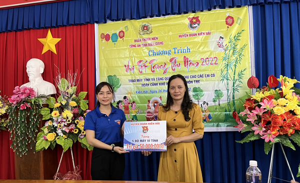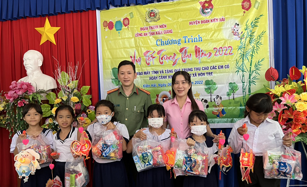 Nhân dịp này, Đoàn Thanh niên Công an tỉnh có vận động trao tặng 05 bộ máy vi tính và 10 máy tính laptop trị giá 150.000.000đ cho Huyện đoàn Kiên Hải; đồng thời trao tặng 50 suất quà trung thu, mỗi suất trị giá 150.000đ (gồm lồng đèn, bánh, sữa, tập...) cho các cháu thiếu nhi có hoàn cảnh khó khăn trên địa bàn xã Hòn Tre.