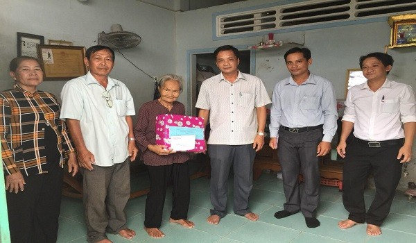 Quang cảnh: Đồng chí Huỳnh Thanh Bình, Phó Chủ tịch UBND huyện và đại diện lãnh đạo UBND xã Hòn Tre, tặng quà cho gia đình chính sách 27-7-2019.