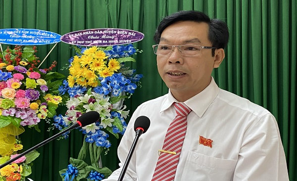 Quang cảnh: Đoàn Hồng Duy - Phó Bí thư Thường trực Huyện ủy Huyện ủy, Chủ tịch Hội đồng nhân dân huyện Kiên Hải, phát biểu hứa hẹn tại kỳ họp.
