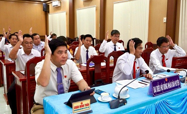 Quang cảnh: Đại biểu HĐND huyện Kiên Hải khóa VIII, nhiệm kỳ 2021-2026 biểu quyết thông qua Nghị quyết