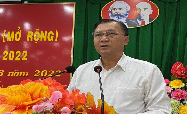 Quang cảnh: Hội nghị Ban Chấp hành Đảng bộ huyện lần thứ IX (mở rộng) sơ kết tình hình thực hiện nhiệm vụ chính trị 6 tháng đầu năm 2022.
