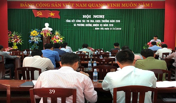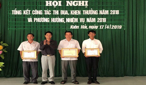 Quang cảnh: Đồng chí Huỳnh Hoàng Sơn, Phó Bí thư Huyện ủy, Chủ tịch Ủy ban nhân dân huyện Kiên Hải, Chủ tịch Hội đồng thi đua khen thưởng huyện tặng bằng khen của UBND tỉnh cho tập thể và cá nhân đạt dạnh hiệu lao động xuất sắc năm 2018.