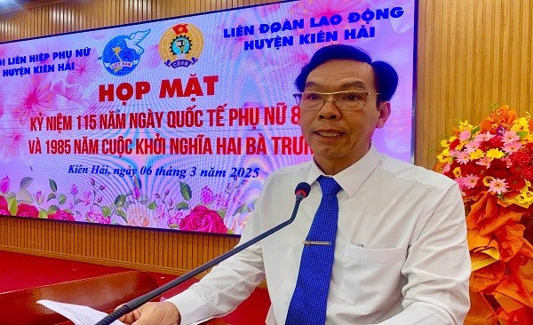Đến dự và phát biểu tại buổi họp mặt đồng chí Đoàn Hồng Duy, Phó Bí thư Thường trực Huyện ủy - Chủ tịch Hội đồng nhân dân huyện Kiên Hải đã ghi nhận, biểu dương và đánh giá cao những nỗ lực, phấn đấu của nữ cán bộ, công chức, viên chức các ban, ngành huyện; cán bộ, hội viên phụ nữ các xã trong thời gian qua. Đồng thời yêu cầu các cấp hội cần thực hiện tốt một số nhiệm vụ trọng tâm trong thời gian tới đồng chí nói: “Tập trung tuyên truyền các chủ trương của Đảng, chính sách pháp luật của Nhà nước, nhất là Nghị quyết Đại hội Đảng bộ huyện lần thứ IX nhiệm kỳ 2020 - 2025; Nghị quyết Đại hội Đại biểu phụ nữ các cấp, nhiệm kỳ 2021 - 2026, Nghị quyết đại hội phụ nữ toàn quốc lần thứ XIII đến cán bộ, hội viên, phụ nữ và nhân dân nắm, hiểu và thực hiện; Tuyên truyền Chủ đề năm 2025 “Tăng cường ứng dụng công nghệ thông tin trong hoạt động Hội” nhằm tạo sức lan toả trong cộng đồng và sự đồng thuận của cán bộ, hội viên, phụ nữ. Kịp thời nắm bắt tình hình tư tưởng hội viên, phụ nữ để tuyên truyền giáo dục cán bộ, hội viên, phụ nữ chấp hành chủ trương của Đảng, chính sách pháp luật của nhà nước để nâng lên chất lượng công tác tuyên truyền; đăng ký và thực hiện tốt Phong trào thi đua “Xây dựng người phụ nữ Việt Nam thời đại mới” và phong trào 2 giỏi “Giỏi việc nước, đảm việc nhà” nhằm giáo dục cho chị em ý thức phấn đấu vươn lên trong học tập, lao động sản xuất và công tác, từng bước khẳng định vai trò, vị trí của mình trong gia đình và xã hội; Thực hiện tốt Cuộc vận động “Xây dựng gia đình 5 không, 3 sạch” góp phần vun đắp giá trị gia đình Việt Nam; Tiếp tục “Tuyên truyền, giáo dục, vận động, hỗ trợ phụ nữ tham gia giải quyết một số vấn đề xã hội liên quan đến phụ nữ; “Hỗ trợ phụ nữ khởi, phát triển kinh tế gia đình; Phối hợp đào tạo nghề, giới thiệu việc làm, thực hiện tốt công tác an sinh xã hội; Chương trình Đồng hành cùng phụ nữ biên cương, Chương trình mẹ đỡ đầu cho trẻ em mồ côi, trẻ em có hoàn cảnh đặc biệt khó khăn, nhằm góp phần nâng lên chất lượng cuộc sống; Tuyên truyền vận động cán bộ, hội viên, phụ nữ hăng hái lao động sản xuất tham gia phát triển kinh tế - xã hội ở địa phương, giữ vững an ninh trật tự và công tác hậu phương quân đội; Vận động hội viên, phụ nữ tham gia đối thoại với cấp uỷ, chính quyền góp phần xây dựng Đảng, chính quyền ngày càng trong sạch, vững mạnh; Quan tâm xây dựng, củng cố tổ chức Hội từ huyện đến cơ sở; Hướng mạnh các hoạt động về cơ sở, kịp thời đổi mới nội dung phương thức tuyên truyền đến cán bộ, hội viên, phụ nữ và nhân dân. Có giải pháp nâng lên chất lượng hoạt động của một số mô hình, tổ phụ nữ còn hạn chế, tiếp tục tập hợp phụ nữ vào tổ chức đạt chỉ tiêu tỉnh giao”.