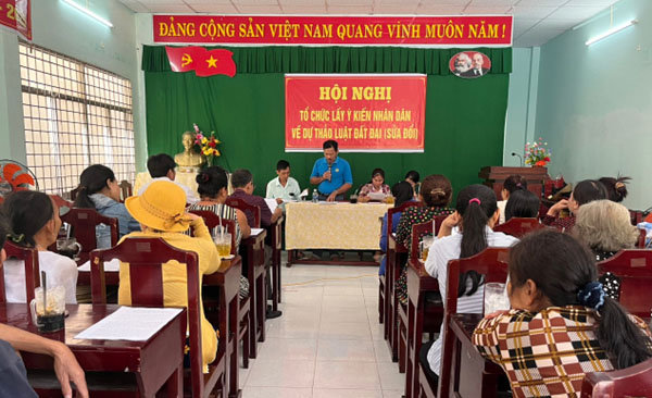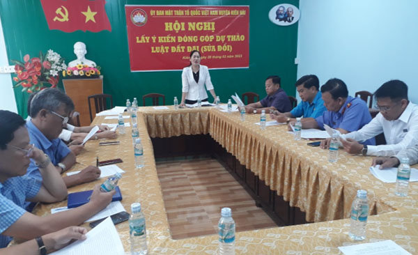 Thực hiện Công văn số 1026/MTTQ-BTT ngày 07 tháng 02 năm 2023 của Ban Thường trực Ủy ban MTTQ Việt Nam tỉnh Kiên Giang về việc tổ chức lấy ý kiến Nhân dân về dự thảo Luật Đất đai. Ban Thường trực Ủy Ban MTTQ Việt Nam huyện ban hành Công văn số 232/MTTQ-BTT, ngày 10/02/2023 đề nghị các tổ chức thành viên, Ban Thường trực Ủy ban MTTQ Việt Nam các xã thực hiện tuyên truyền dự thảo luật lồng ghép tuyên truyền, phổ biến và phối hợp tổ chức lấy ý kiến góp ý của đoàn viên, hội viên, các tổ chức thành viên của Mặt trận cùng cấp, các vị Ủy viên Ủy ban, bằng nhiều hình thức phù hợp với tình hình thực tế của địa phương, đơn vị như: tuyên truyền trong các hội nghị của Ủy ban nhân dân cùng cấp, qua các cuộc họp của Ban công tác mặt trận ấp, sinh hoạt lệ của các tổ chức đoàn, hội cơ sở, ở địa bàn dân cư; qua mạng xã hội, các nhóm chung zalo, facebook; qua mail điện tử cơ quan, đơn vị... kết quả tuyên truyền, phổ biến được 29 cuộc với 953 lượt người tham dự. Qua đó Ban Thường trực Ủy ban MTTQ Việt Nam các xã chủ trì lấy ý kiến đối với các tổ chức thành viên, ủy viên và các ban, ngành, Ban Nhân dân ấp và nhân dân, kết quả được 22 cuộc có 757 lượt người dự, tổng hợp 10 lượt ý kiến.