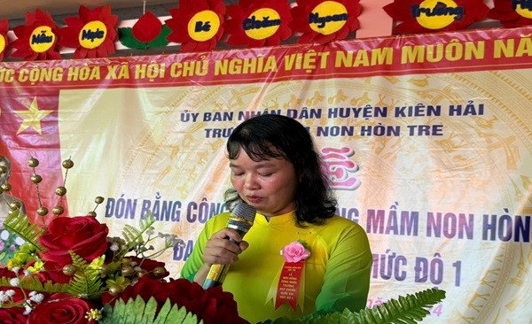 Quang cảnh: Cô Nguyễn Thị Tuyết Nhớ, Phó Hiệu Trưởng trường mầm non Hòn Tre, báo cáo tóm tắt quá trình xây dựng trường đạt chuẩn quốc gia mức độ 1.